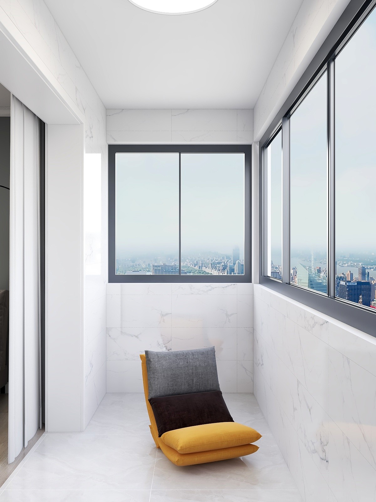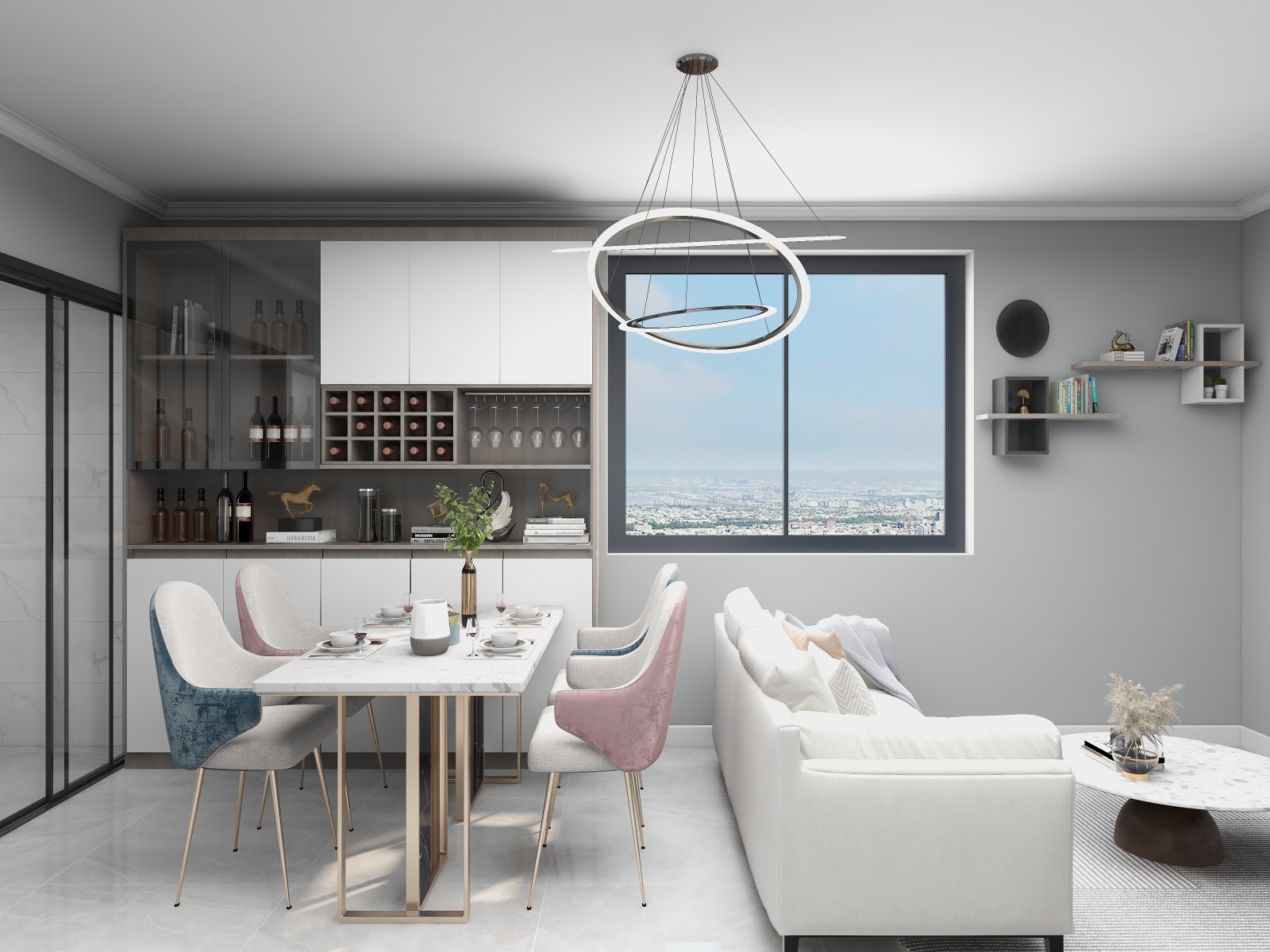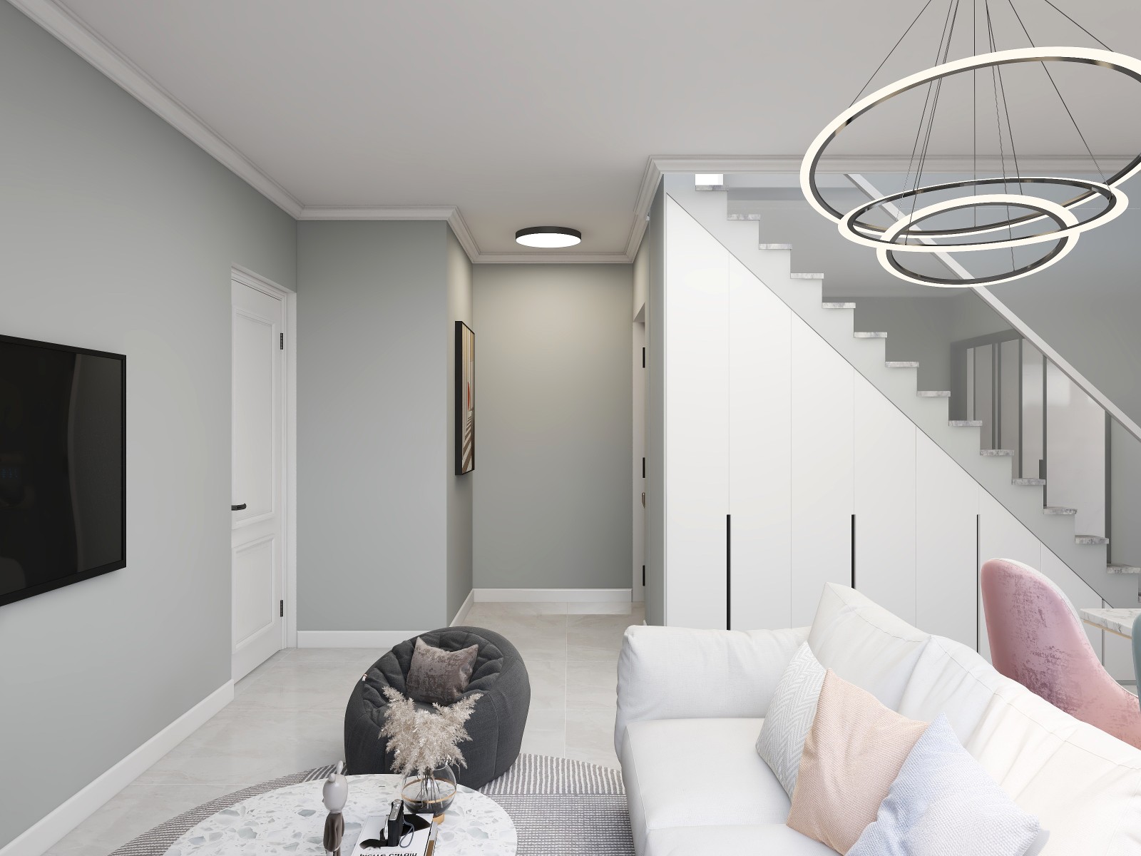 入户有一个小玄关,蓝灰色的墙面搭配一副艺术挂画。屋主喜欢简简单单的生活,所以吊顶不造型,也没有做背景墙,白色的双人沙发,搭配一个懒人沙发和大理石的小茶几,客餐厅和厨房在同一条直线上,动线简单,条纹地毯使客厅更有区域感。