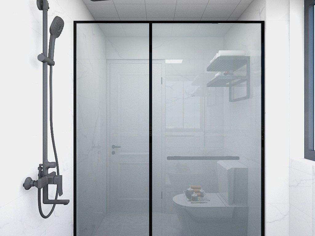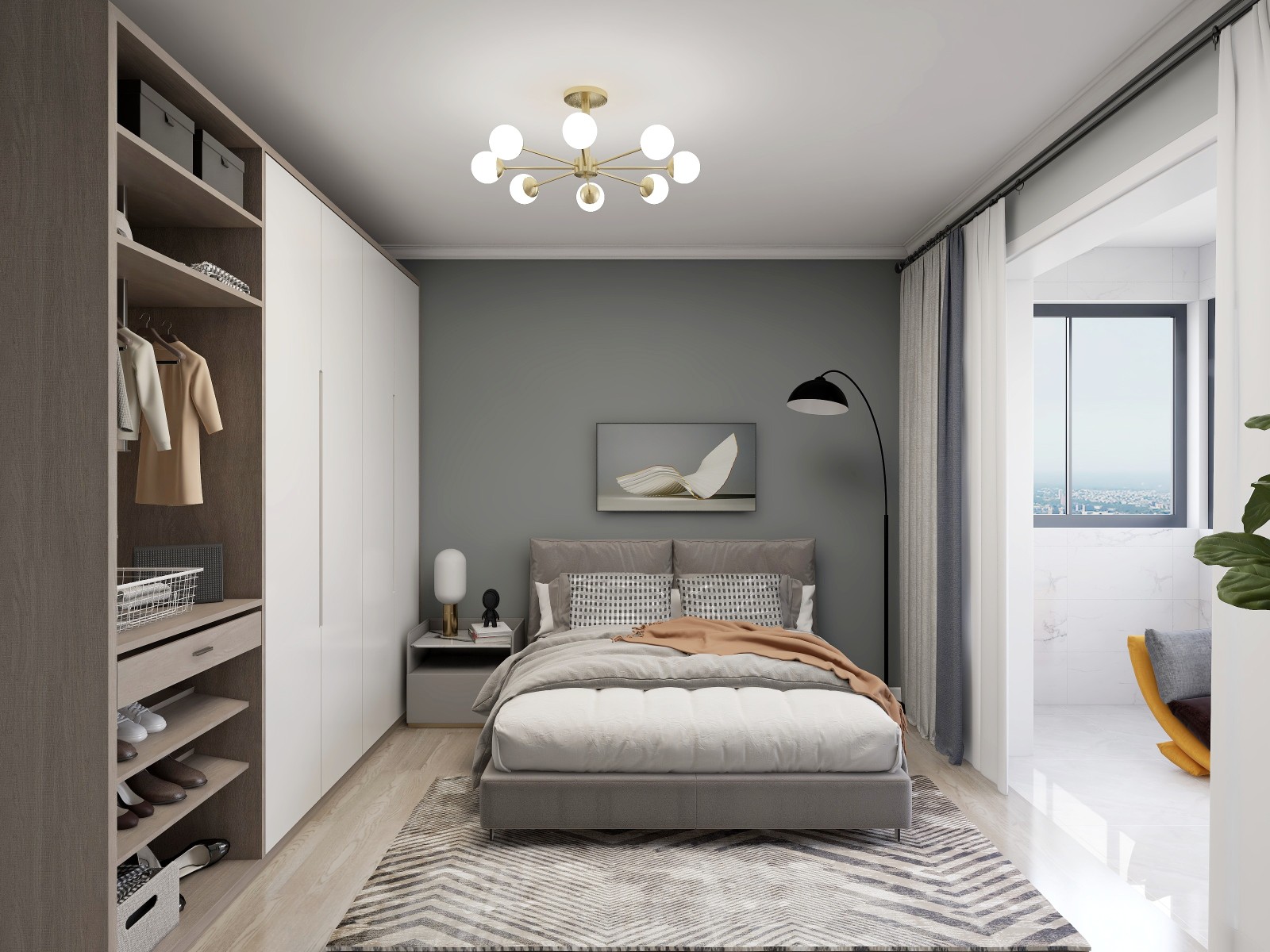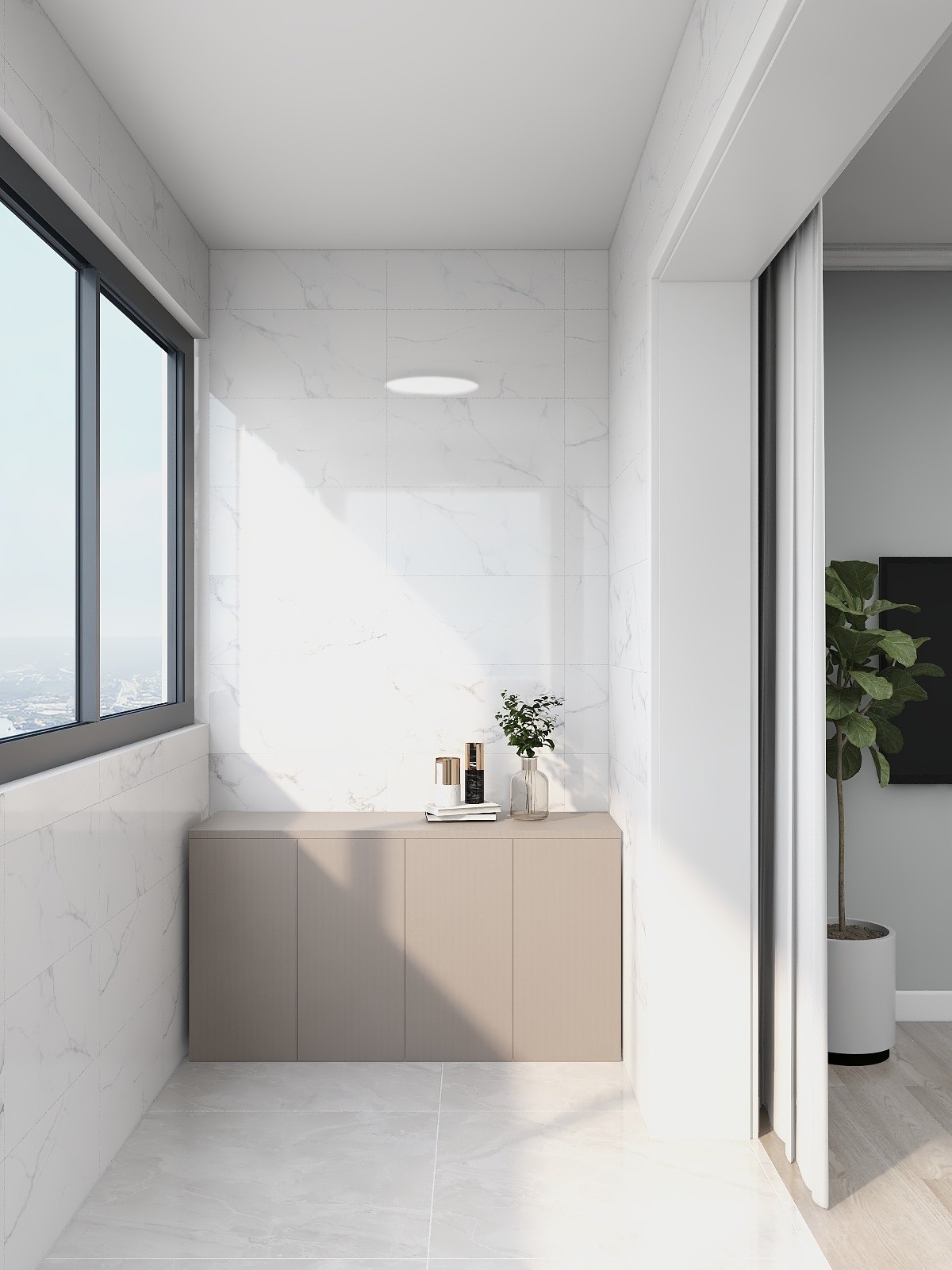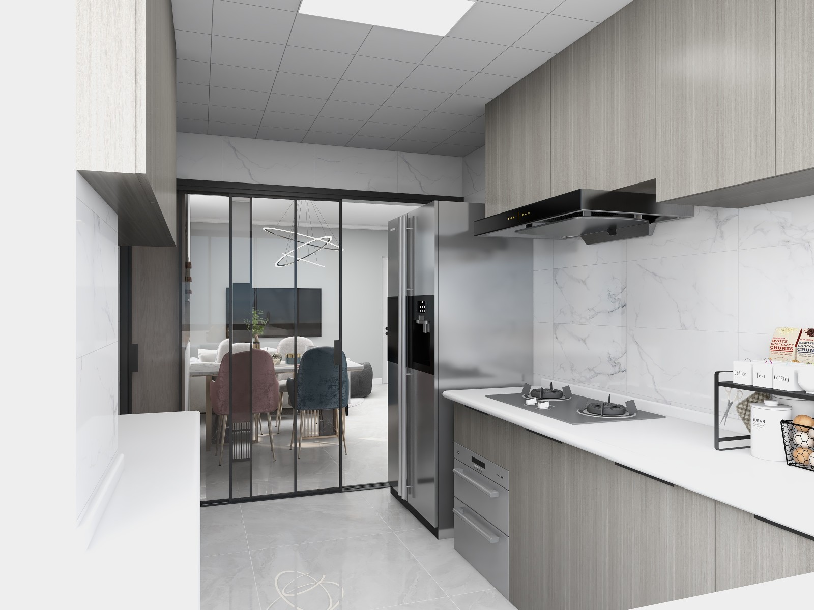 入户有一个小玄关,蓝灰色的墙面搭配一副艺术挂画。屋主喜欢简简单单的生活,所以吊顶不造型,也没有做背景墙,白色的双人沙发,搭配一个懒人沙发和大理石的小茶几,客餐厅和厨房在同一条直线上,动线简单,条纹地毯使客厅更有区域感。