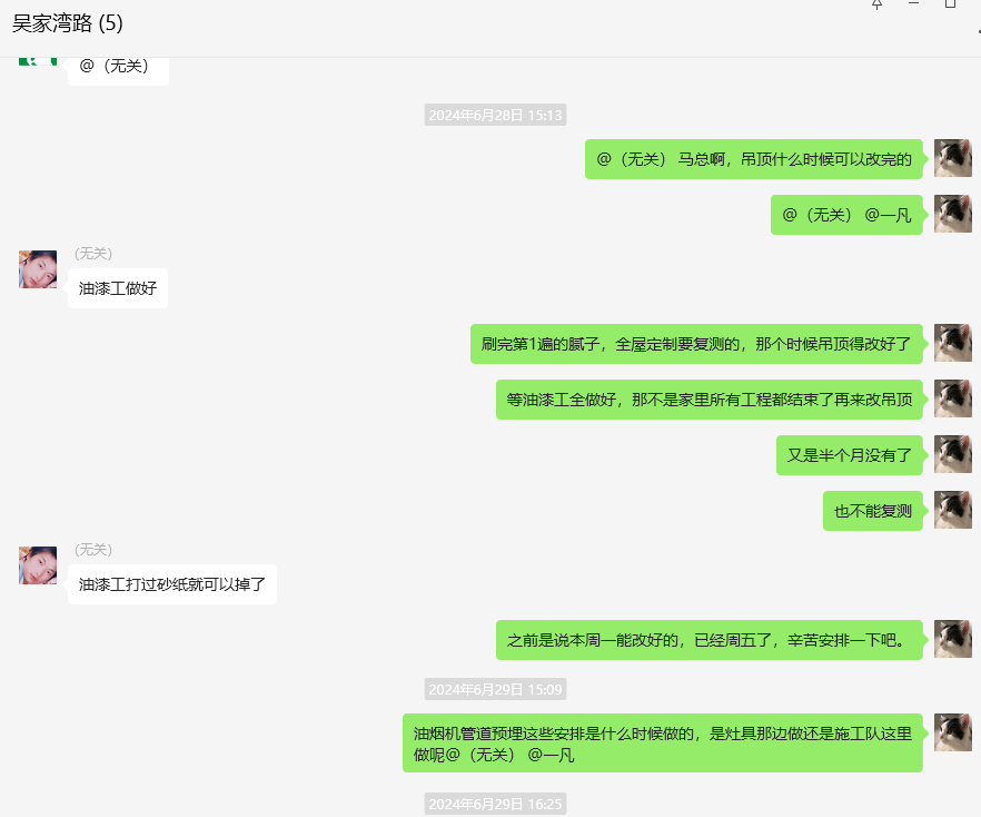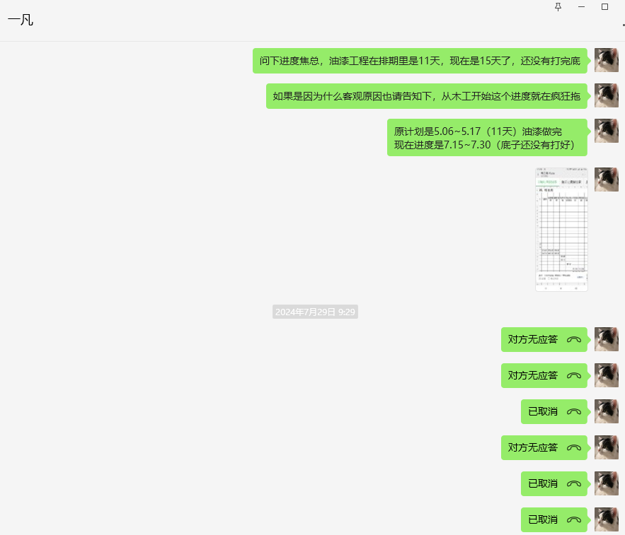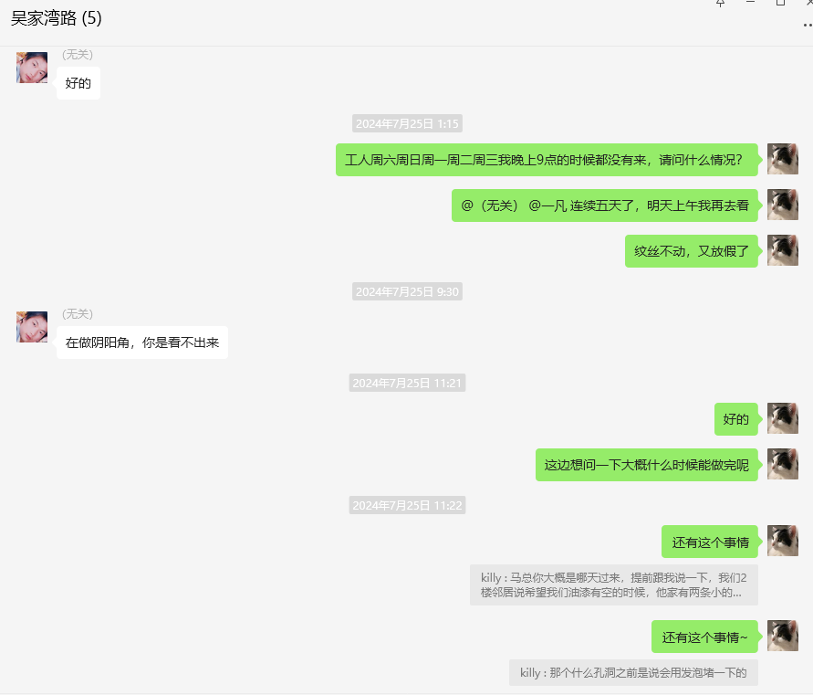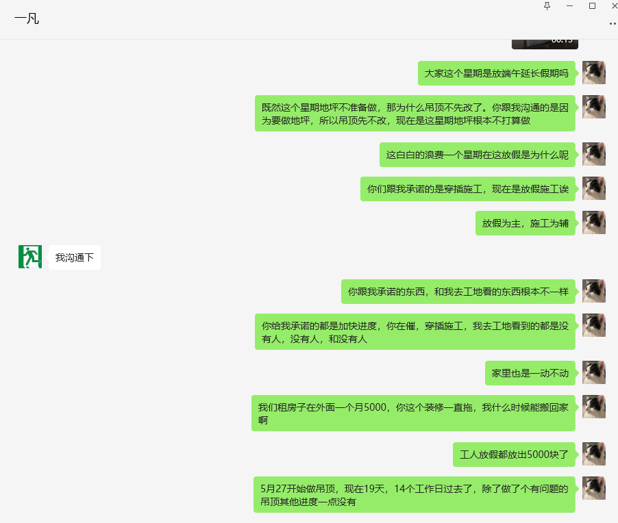 承诺加紧施工1个月完工实则3个月还未完工的聊天记录