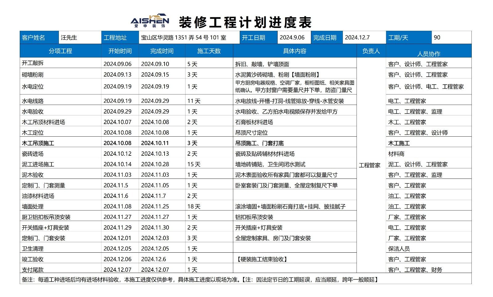 业主汪先生在装修上做了充分功课的业主,对于工艺,材质这块他是非常注重的。每一次的现场沟通,我们都是很仔细的与他说明清楚施工的做法,材质的品牌和材质的应用以及注意事项。经过多次的沟通最终选择了我们爱申装饰。在此,我们非常感谢业主汪先生对于我们的信任和重托。