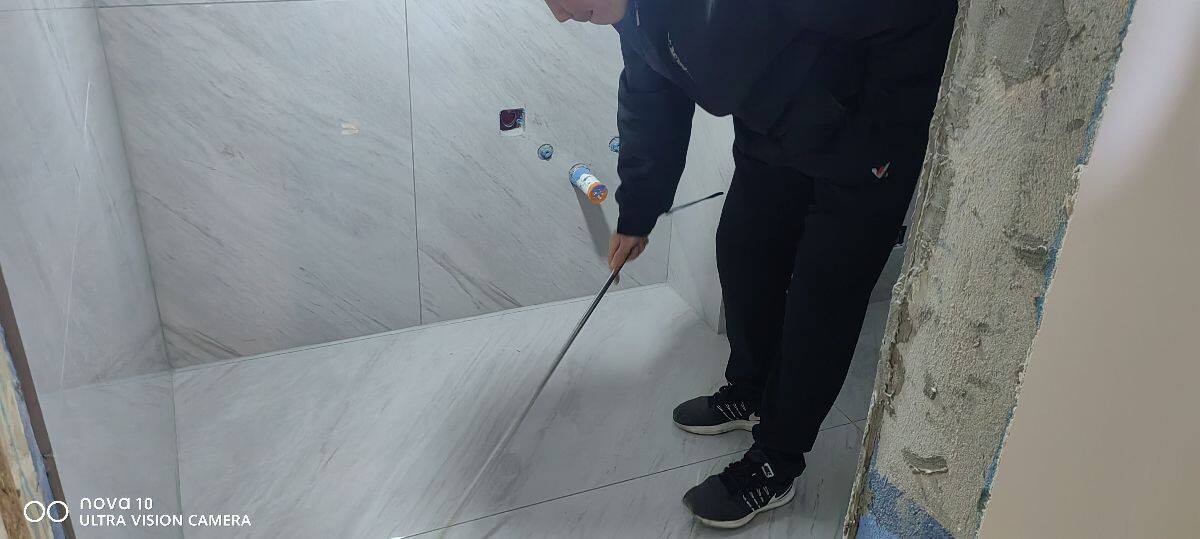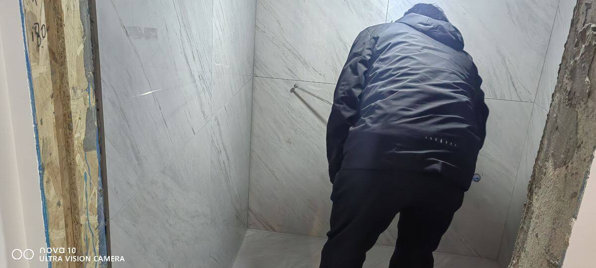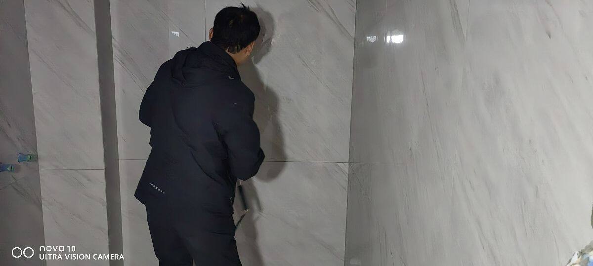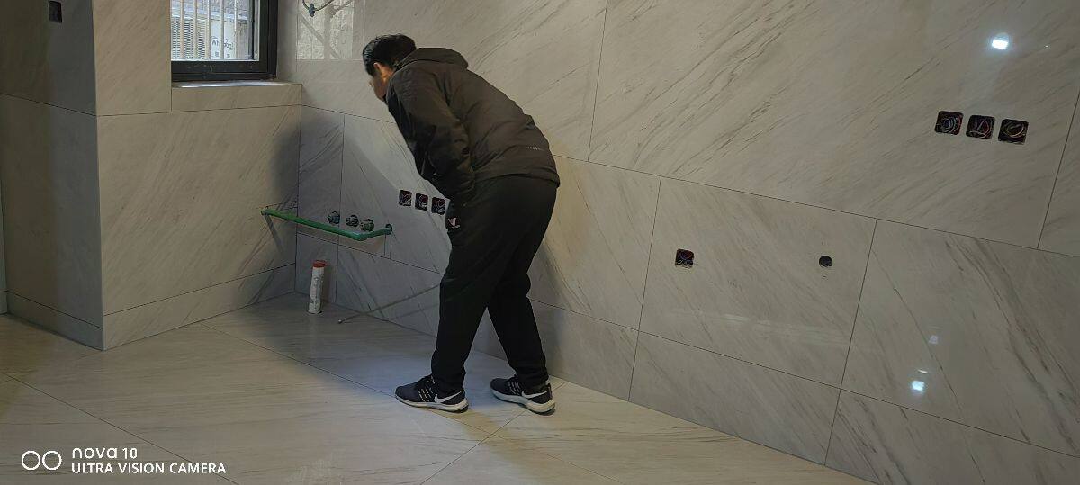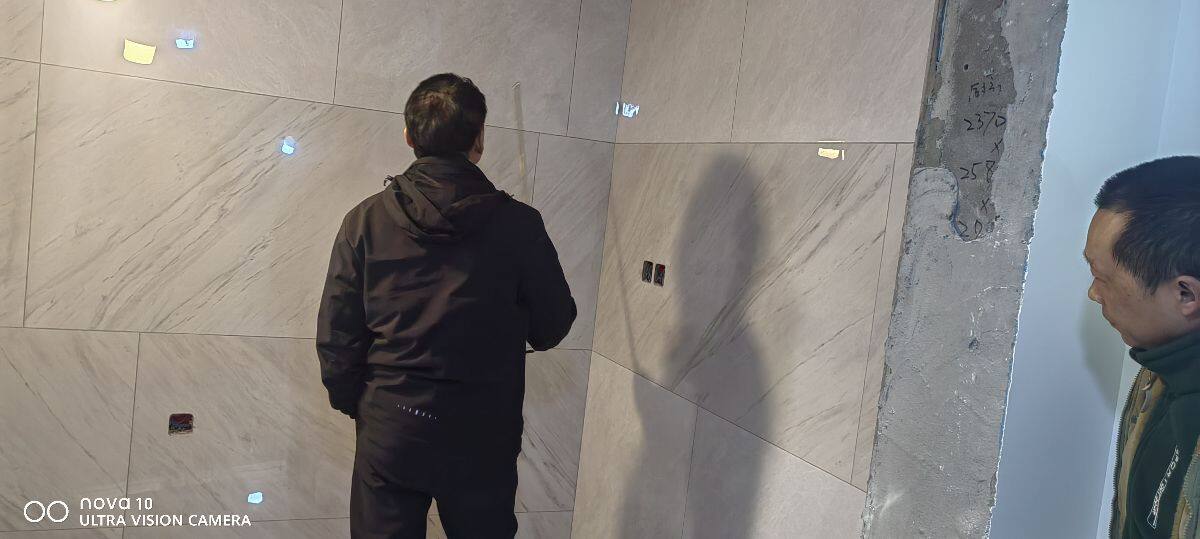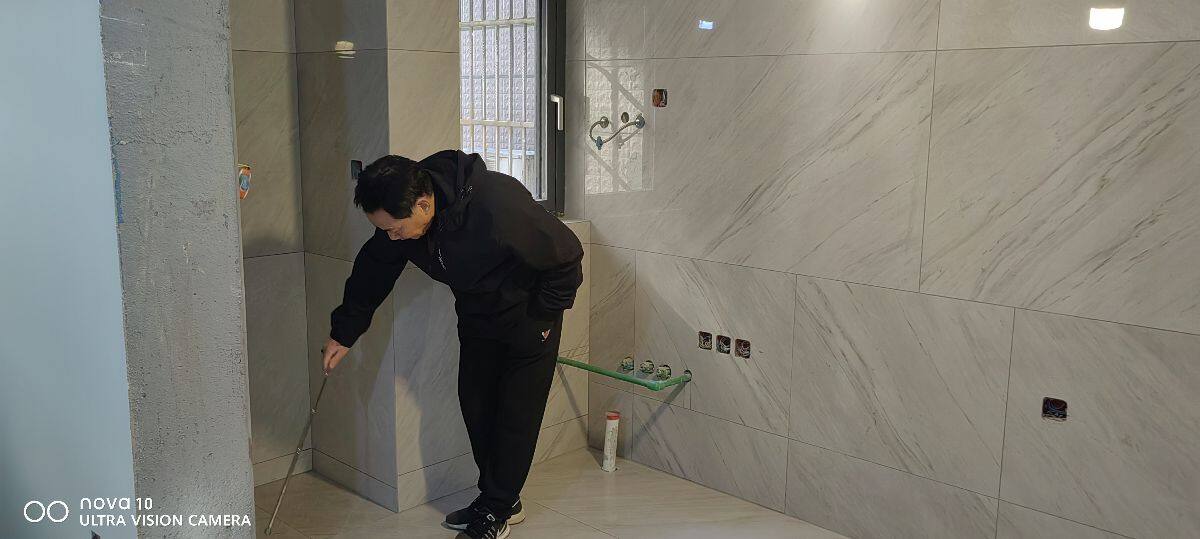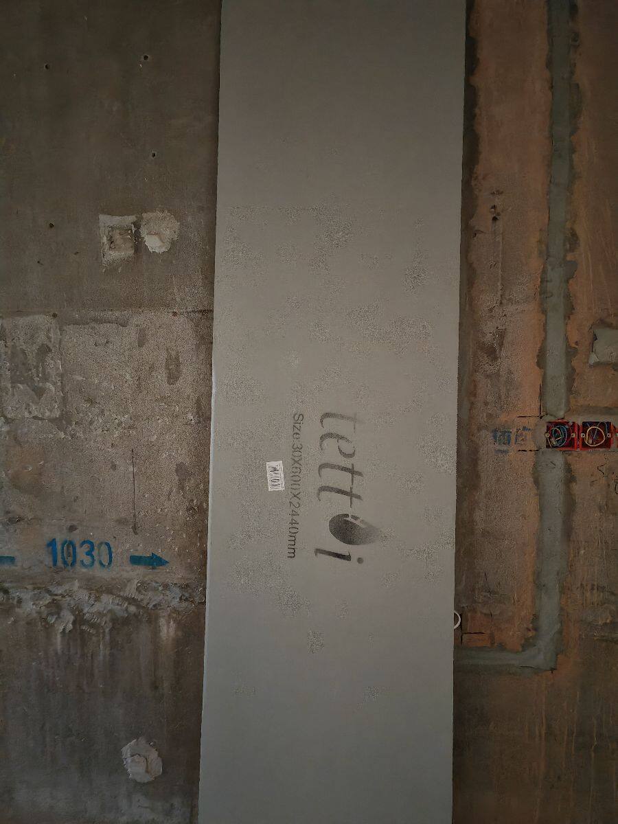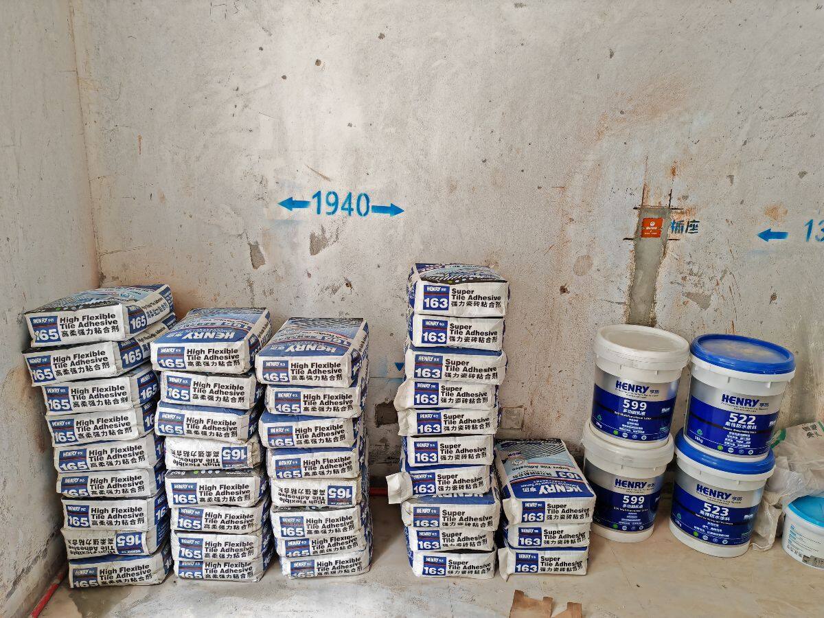 业主汪先生家里的木工施工已经结束。欧松板用的是万华的,环保等级ENF。石膏板也是万华的;在制作窗帘盒的时候,墙面开槽,把欧松板植入墙体,这样做不容易开裂。卫生间包下水管,我们这次运用了tetti(台迪)防水背衬板,这样做可以节约空间,增加了隔音的性能。目前泥工铺贴还在施工中,由于业主家里砖的规格是1500*750的,地砖我们这次配的是亨历C2TE的瓷砖粘合剂,运用卡罗蒂尔工艺进行铺贴;上墙的砖我们用是亨历C2TES1等级的瓷砖粘合剂进行薄贴。防水我们使用的是亨历的522(墙面用刚性防水)523(地面用高弹性防水)。