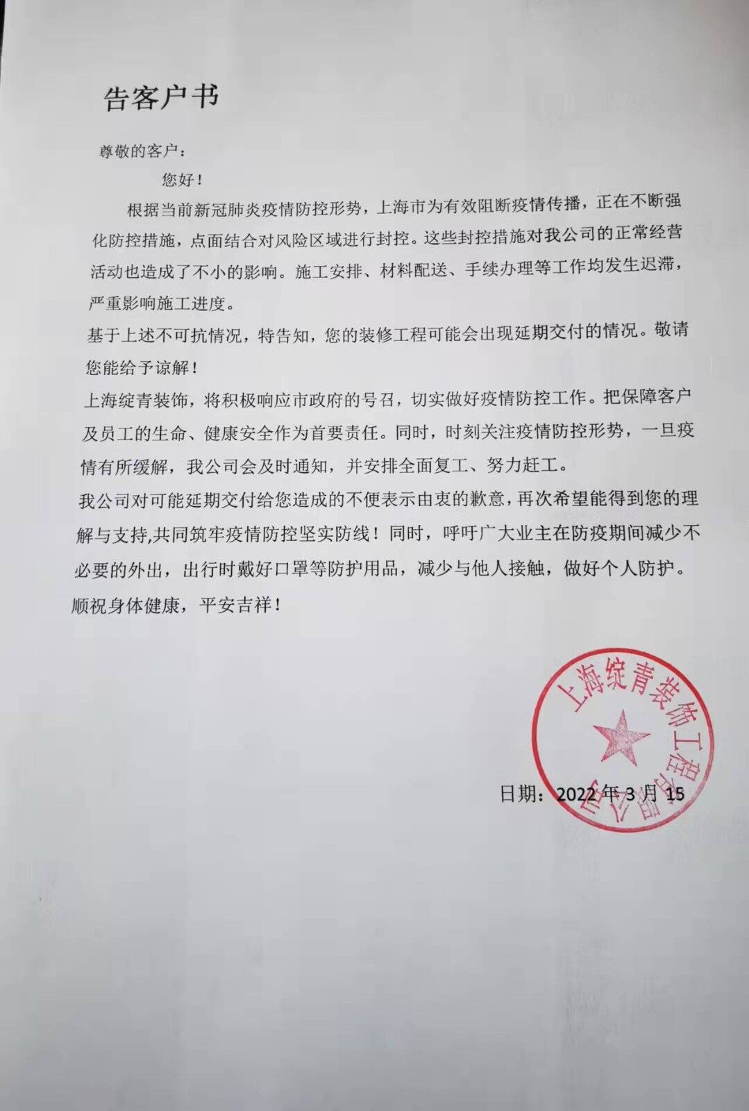 基于上述不可抗情况,特告知,您的装修工程可能会出现延期交付的情况。敬请您能给予谅解!