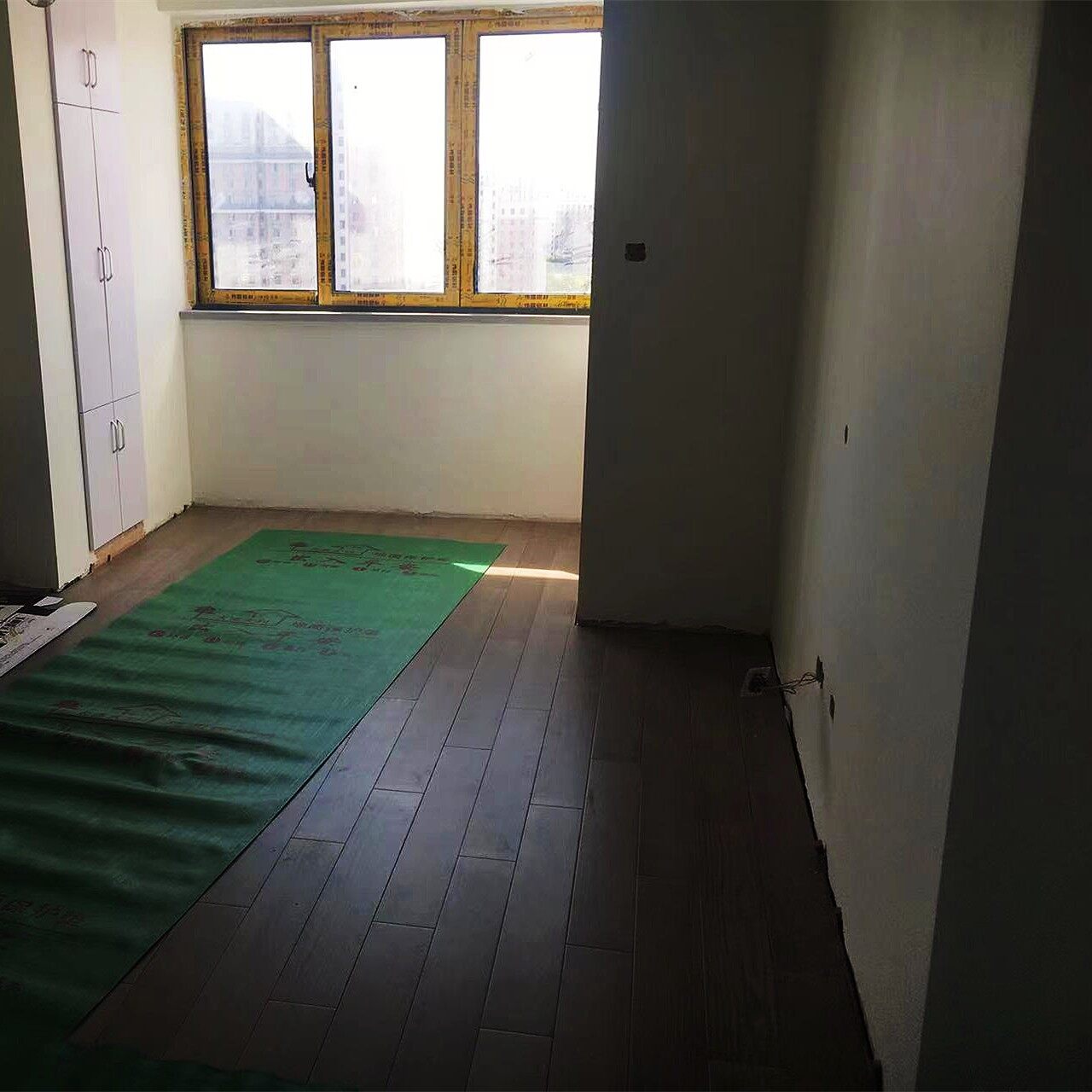 工地巡视,高温环境中,师傅在辛苦工作,瓷砖已经全部铺贴结束,已开始防水测试。下一步油漆进场。