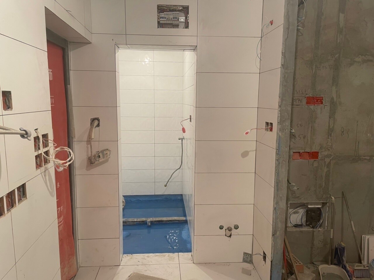 厨房墙地砖完成,卫生间防水、墙砖完成,地面防水已做测试中。
