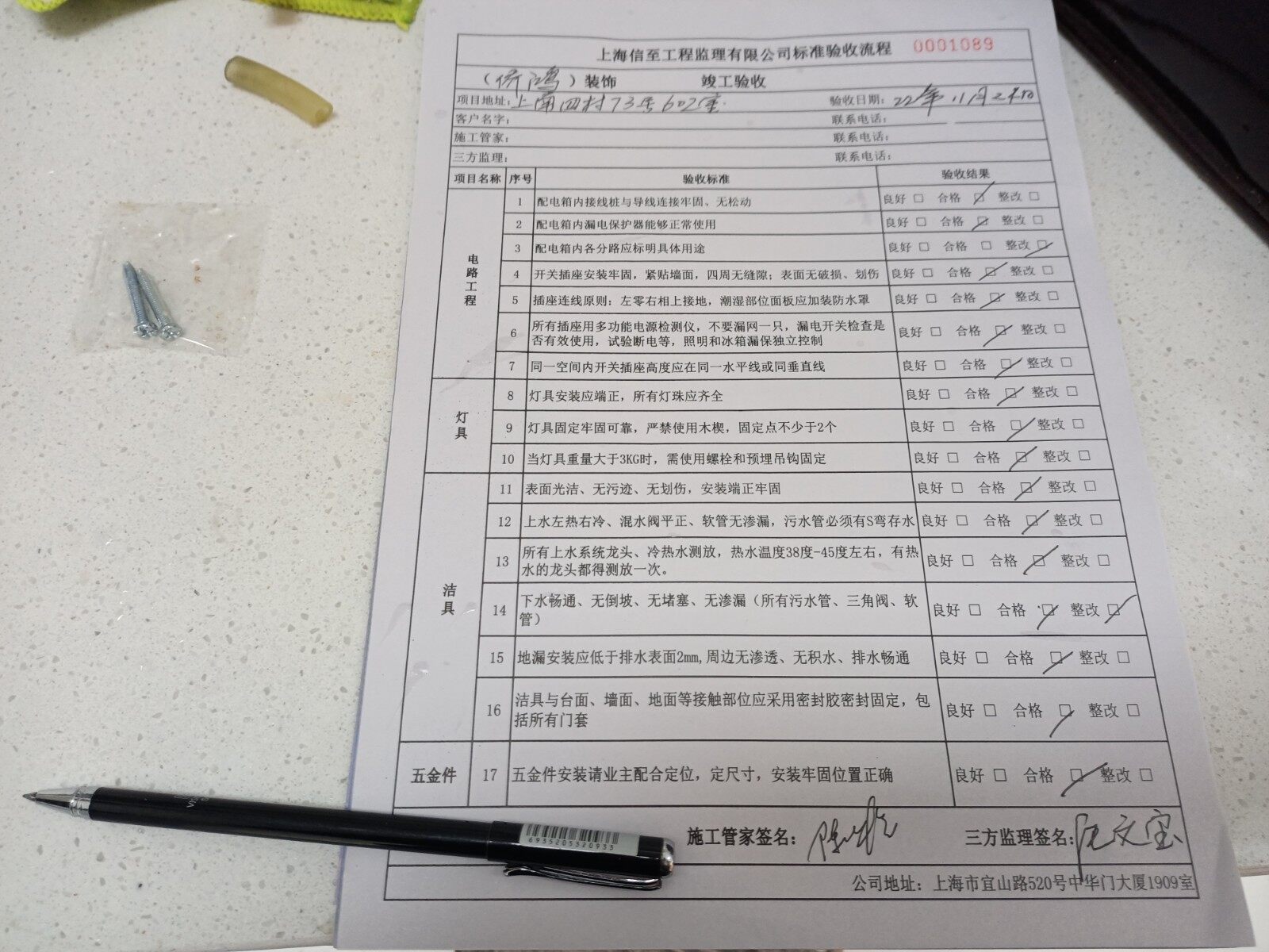 竣工验收:1:开关灵活,插座相位正确,洁具安装到位,水槽下水需调节,空气开关标签需贴好,涂料个别修整。