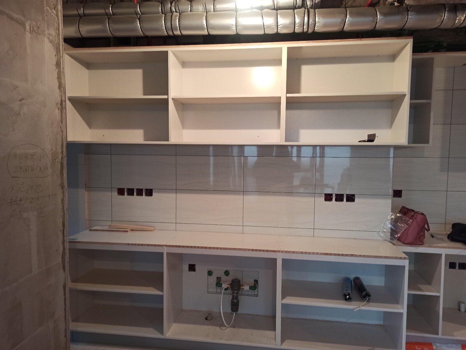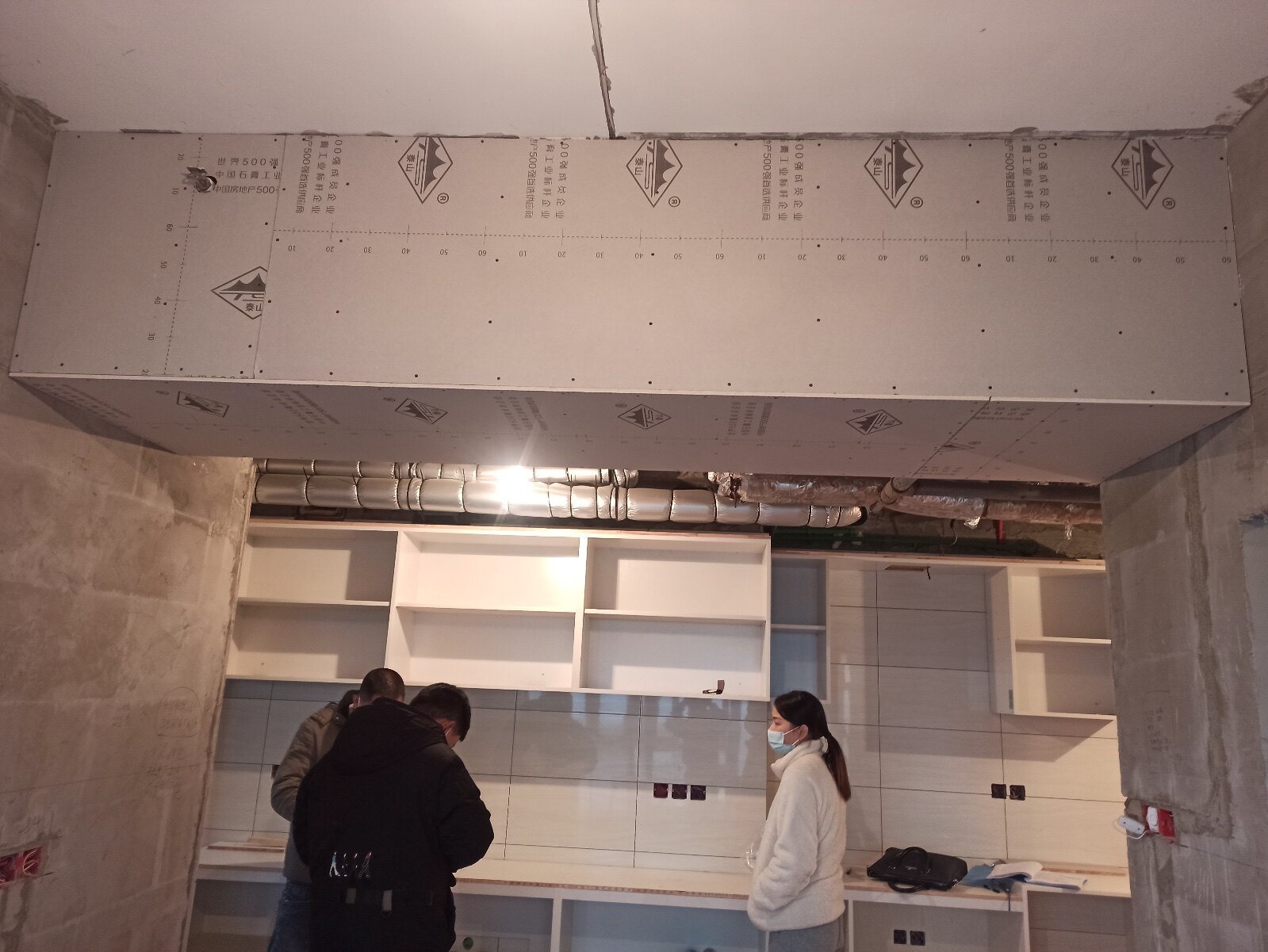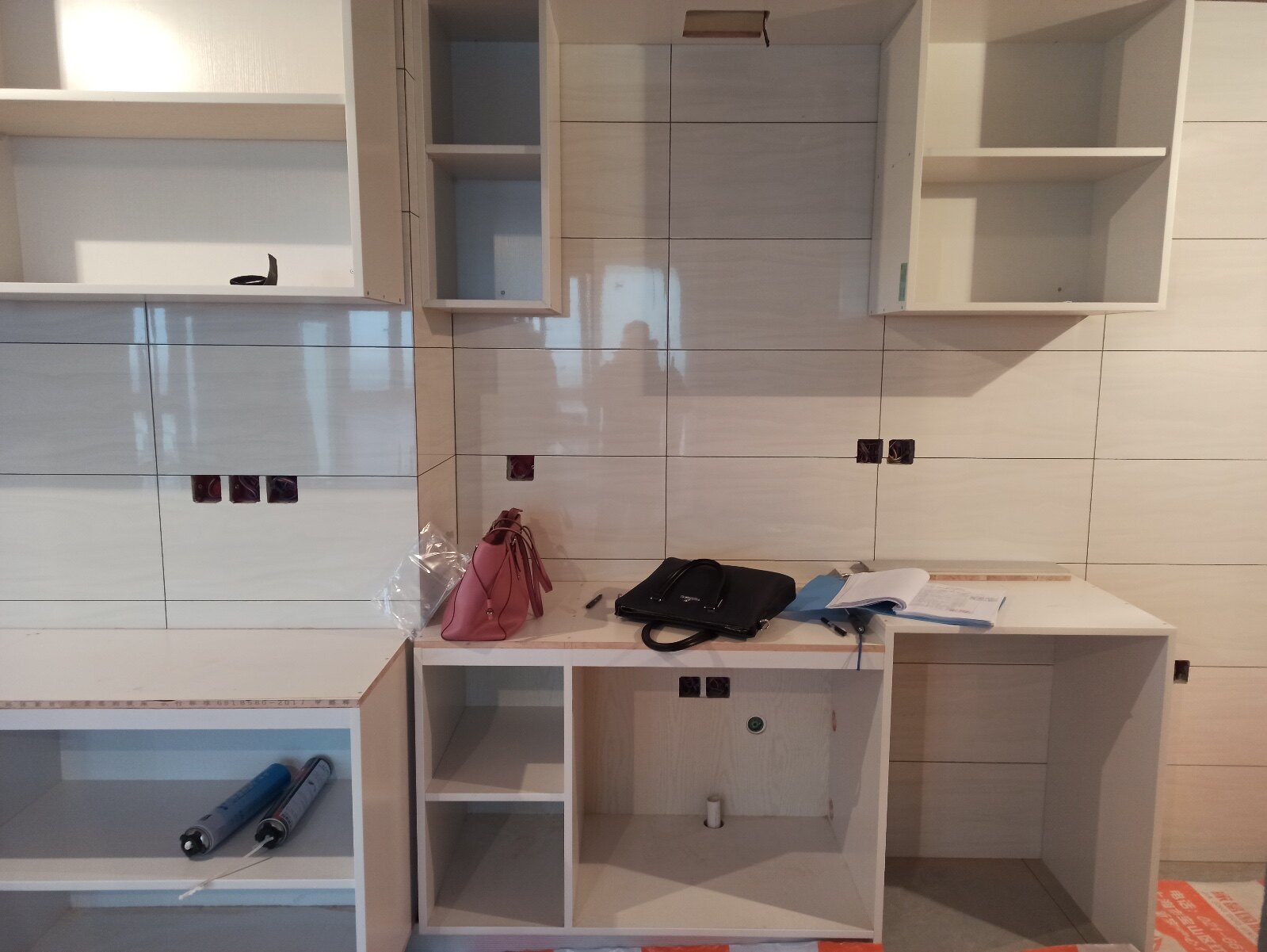 吊顶平面平整,木作柜子构造直平,拼接严密顺直,与墙体间无缝隙,瓷砖铺贴牢固,无空鼓现象,木作时地面保护膜保护完善,不会对地面造成釉面损伤,整体施工考虑完善。