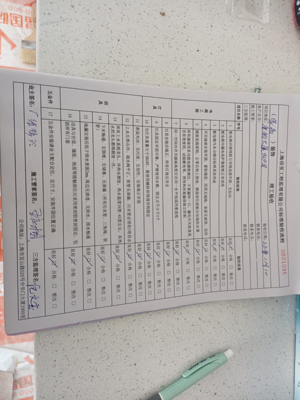 竣工验收:灯具安装到位,开关插座电路正确,洁具安装规范,涂料墙面平整,阴阳角顺直,厨柜及家俱设计合理,个别不足还望改进。