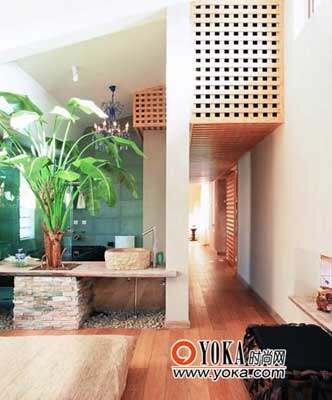婆娑的芭蕉树、粗糙的石台,看上去像是把外面的花园搬进了屋里。从生态产品到生态家居,随着国人环保意识的提高,越来越多的人把保持生态平衡的绿色观念引入了生活。与传统设计相比,“生态家居”更加注重在居室中生理与心理的健康,在室内空间的自然性、材料、湿度、温度等方面有着更为合理的统筹规划,从而在更高更广的范围内营造舒适、自然的居住感觉。