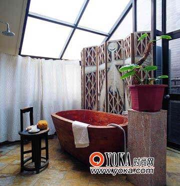 将露台改成浴室,明亮的天顶采光,放在浴室中间的木质浴盆,粗犷的石材地面以及带有强烈的民族图腾式装饰纹样的屏风,组合成质朴、浑然天成的原生态氛围。这种风格的设计灵感,最初来源于广袤的非洲大地,原生态风格的居室出现在都市住宅里,使都市新贵寻觅到返朴归真的自在空间。