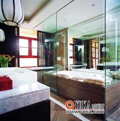 厚重的石材与轻盈的玻璃让卫浴间充实而简洁,没有过多的装饰,而用中式的雕花窗扇来营造浓郁的浪漫风情。透过雕花斑驳的光影,原本直白的光线变得富有情调,简练与柔媚,两种不同的风情因为阳光的融入,巧妙地结合在一起。而木质窗扇既不怕水又能透光,是布艺窗帘所不能比及的。