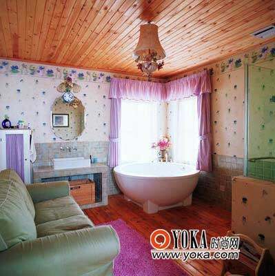 有人说浪漫与实用不能兼得,现在你要改变这个看法。在不同的材质、不同的风格中自然过渡,就可以让浴室在原有的使用功能不被破坏的同时兼具童话般的效果。墙面的下半部用瓷砖代替了壁纸,可以延长壁纸寿命、方便清洁;木地板与木质顶棚的介入可以弥补瓷砖的冰冷,让原本触感坚硬的四壁舒适温馨。