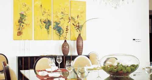 餐厅的墙面加以黄色的组画装饰不仅能增添用餐食欲,而且也让空间富有暖意