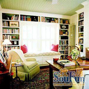 原本普通的一扇窗户,四周做成书架,窗台下摆张长条的柜子做成飘窗露台。倚坐在飘窗上,随手就能拿到书籍,休闲阅读好不惬意!