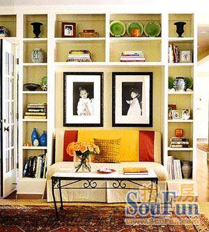 概要: 还在为家中没有足够的收纳空间而头痛吗。何不尝试向你的墙壁要空间。搜房小编为你带来15款案例,看图说话,说说如何在墙壁上找出收纳好办法。 1、利用一整面墙 不要害怕使用能遮住一面墙的大型收纳架,架子只要普通的款型即可,价格不会很贵。在这个案例中,书架规整对称,中间又留下一个较大的空格挂照片,整体看来并不会显得很混乱。