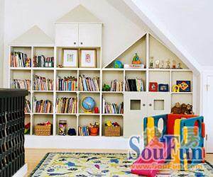 收纳的架子并不是一定要在方正的墙面才可以做,像异形空间同样适用,只需把顶端做成“盖子”就行,造型反倒更有趣,图中这个儿童游乐室就是完美范例。