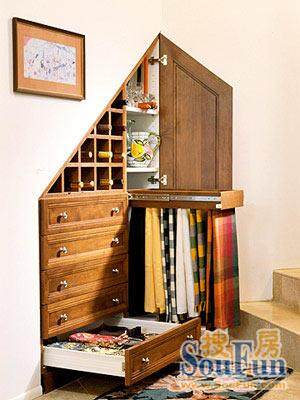 为楼梯下方的空间量身制作一个柜子,多种功能的格子和抽屉都有,可以装下衣服、配饰,甚至能装酒。
