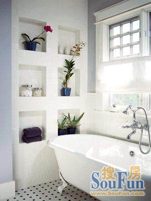 6个收纳的格子上摆着各种植物,在绿意盎然的花园气息中泡澡一定是美妙的,当然,如果你不想要植物,这里也能摆下所有洗澡时需要的东西。顺便说一句,设计的灵感来自右边的九格窗。