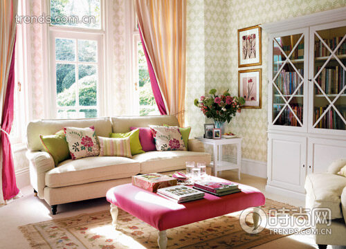 为平淡的空间加入一至两种主题色彩,能迅速获得惊艳的效果。有了颜色作为装饰主线,无需再加入过多的配饰。如果房间里的辅助色彩用于墙面等大面积装饰,那么主题颜色的使用面积就要相对小些。比如这里的粉色沙发凳,还有双面窗帘中隐约出现的粉色。总之,主题色不能超过整体色调的10%。用靠包、鲜花等与主题色相呼应,令空间造型更显完整和专业。