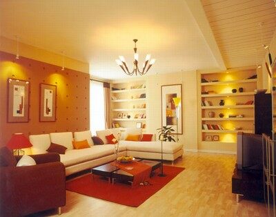 客厅的三面墙用淡黄色乳胶漆处理,家具的选择以白色为主,配以红白相间的沙发。因为客厅面积较大,所以选择了宽大的多人沙发,与旁边的单个沙发椅形成了L形布局,沙发后面的墙壁设计了反射灯作为局部光源,沙发与电视柜的距离较远,这样无论是休息还是观看节目都非常舒服。