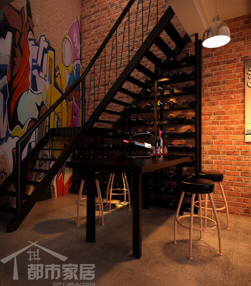楼梯、酒架、餐桌,几个黑色的点形成了一个面,与图一中的沙发一前一后呼应起来,不会使空间因为一头黑色面积过大而产生一头沉的感觉。