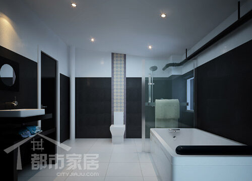 卫生间商务味道浓厚,整个空间设计非常的大气。洁具外形相当的精致,少而精,这点保持了其它空间的设计特点,但空间画面看起来还是相当的丰满。黑白色的搭配从视觉上将空间一分为二,非常明确。是使用商务主义很好的体现。