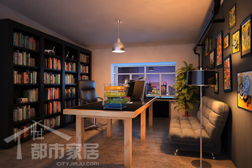 二层书房的设计沿袭了一层涂鸦风格路线,设置了很多的小幅装饰画。虽然单幅画面色彩、形式都十分跳跃,但以深灰色作为底色,又很好的把装饰画统一在墙面之上。