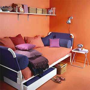 我想每个单身的女孩子都会喜欢这张床吧。虽然看起来是张再简单不过的单人床,但是颜色的搭配和那么许多靠垫,都是我最爱它的原因。看起来是不是很温馨啊?