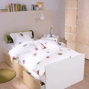 简约的单人卧室。床下的小抽屉可以方便收纳,床头的隔板和床边的边柜都是很容易置办的。白底小花的床单也非常清爽。如果你是在外租房的女孩子,这样简单又不失温馨的搭配应该很适合你吧!