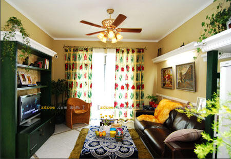 客厅中设计了几段眉檐,它们并没有连绵不断,而是错落有致的断开,制造了一种残垣断壁的意境。沙发旁的冰箱上方设计成凉亭状,恰似户外花园的景致。墨绿色的家具,有点复古,有点张扬,又有点刁巧,仿佛让人感觉回到了原野上。客厅的吊扇灯,复古的精致雕花,展现优雅、细腻的风情。