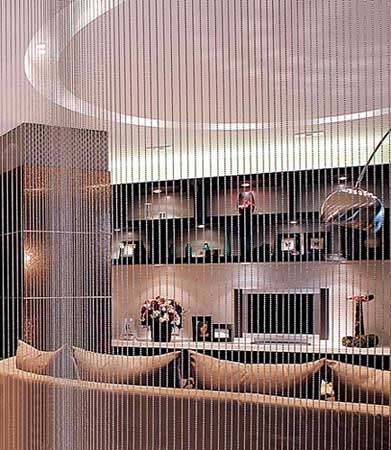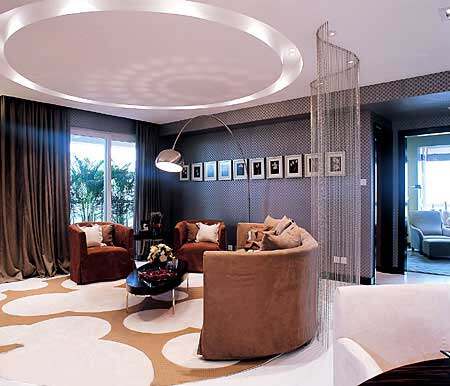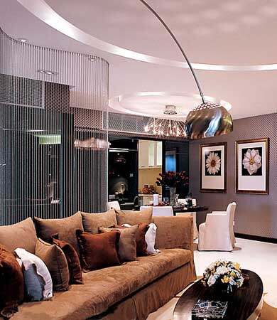 餐厅与客厅用圆形的天花灯槽增强了空间的独立感,弧形的座灯与圆点图案的地毯令整个空间气氛沉静却不失活泼。临空而悬的水晶珠帘是客厅的生辉妙笔,把饭厅与客厅区分开来,然而有隐约可见对方,给居室布置了一种隔而不断的布局。