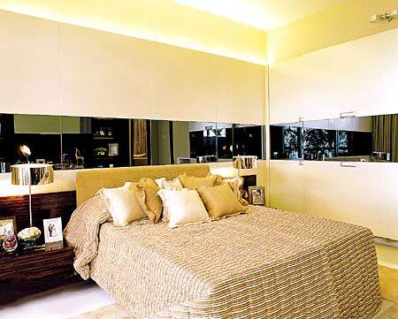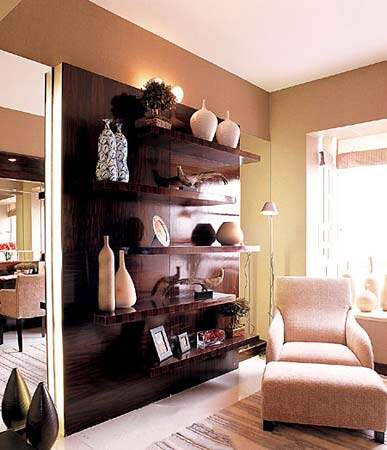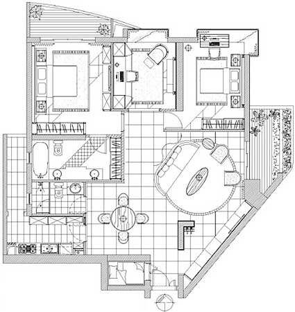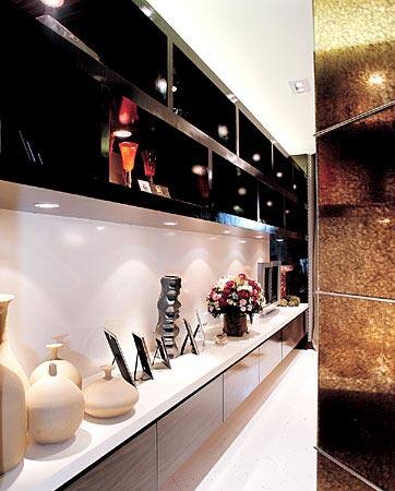 客厅、卧室和书房到处陈列着年轻新贵所喜爱的艺术摆设,洗手间也以紫啡色调的玻璃马赛克为铺地和墙身贴面,并配以茶色镜面,加上石台的折射,让里外的空间都统一在另类、浪漫的格调之中。淡淡的悠然从客厅流淌到饭厅,汇入纯洁的白,激荡起一轮轻快的圆舞曲,一路高调,意欲歇而情不止……