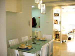 造型别致的新怀旧吊灯将是扮靓餐桌的不错选择。黄色的灯光从四周倾泻而下,让冰冷明亮的金属餐具似乎都能迸发出强烈节奏。散布于柜体后的小射灯将光线聚焦于主人从各地淘来的摆件。明黄色、玫瑰色、金色在暖调灯光中跃动着,亚克力、金属、黑橡三种元素构建的餐桌椅与暖色的灯光形成了一种材质与光线的游戏。