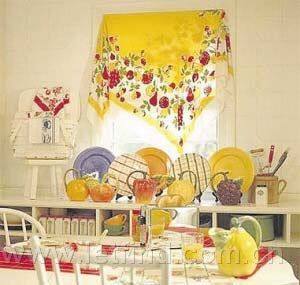 将喜欢的丝巾对角折起来用图钉挂在窗口,再在下方的矮柜上将自己平时收集的颜色与丝巾相配的美丽餐具摆设起来,是不是别有情调?如若搭配上白色的百褶帘,效果更好。
