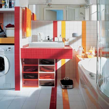 组合与隐藏方式真的是令人乐此不疲,即使是浴室也有可以施展的空间。与淋浴房结合在一起的组合浴缸,利用有限的空间满足了两种不同的洗浴要求,说经济实惠一点也不过分。洗面盆台面下的空间安置了带透明门的收纳柜子,里面的物品一目了然,却不碍观瞻。一道普通的半隔断分离出一个独立的洗衣间,一道软百叶帘又将这个洗衣间巧妙地隐藏起来。整齐有序的空间着实令人羡慕,其实只要你愿意,在自己的家里也不是不能实现。