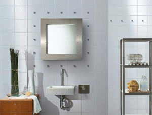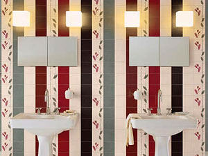 典型标志:瓷砖多以浅色调为主,也可以用对比色关系体现。所用砖面多表现为平整光滑或有规律性、有节奏的凹凸。洁具多会选用纯白色。水龙头选用多彩色、白色或镀银等。